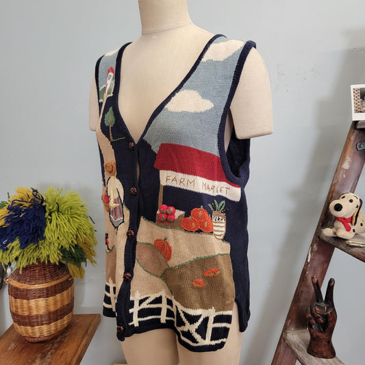 vtg 80s FARMERS MARKET SWEATER vest // vintage capacity large womens hand knit oversized v neck americana folk art vegetables granola style