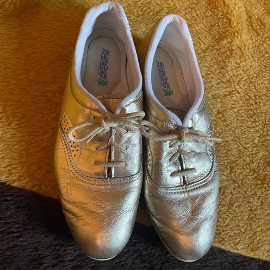 vtg 80s GOLD LEATHER SHOES // vintage lace up keds style metallic sneakers shiny autumn retro style fashion casual comfy granny core loafers