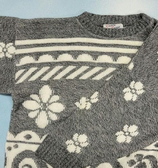 vtg 80s GRAY FLOWER SWEATER // 80s Mod / Silver Floral Sweater // Floral Jumper mited tones chunky 90s school teacher student fluer logo aop
