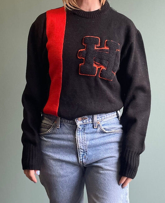 vtg 80s GOTHIC VARSITY LETTERMAN Sweater // vintage cheerleader outfit preppy school cropped two tone striped knit mod retro halloween fall