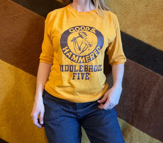 vtg 80s GOOD & HAMMERED Tee // yellow paper thin graphic wacky packs arm hammer footbal jersey t shirt size XL Soffe tags middlebrook five