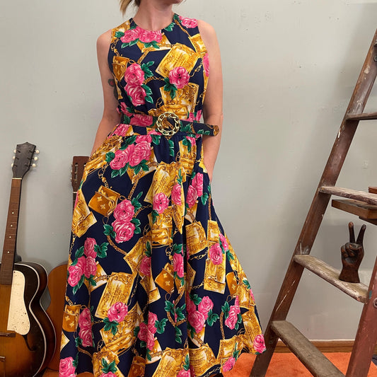 vtg 80s GOLD CHAIN PRINT Dress / pink roses flowy slinky day dress with pockets floral tank dress hermes gucci mob wife gaudy 90s designer