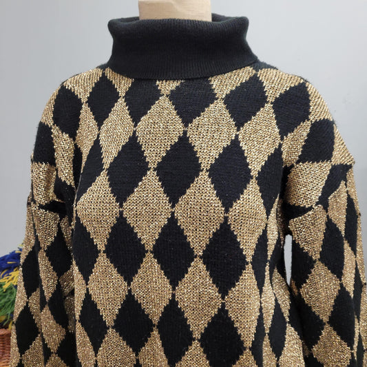 vtg 80s GOLD LUREX SWEATER // vintage silvercord large turtleneck metallic knit diamind checkered funky glitter new years holiday party top