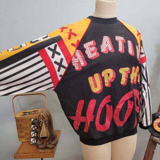 vtg 80s HEATIN UP The HOOPS Pullover // vintage basketball xl scorecard referee stripes crazy spell out hip hop style pop art all over print