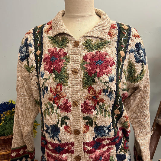 vtg 80s HEAVILY EMBROIDERED CARDIGAN // vintage stitches in time small womens cotton button up thick chunky knit cottage core cozy autumn