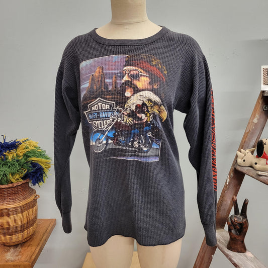 vtg 80s HARLEY DAVIDSON THERMAL top // vintage mens fashion thermal xl waffle weave 3d emblem biker soft winter eagle motorcycle graphic
