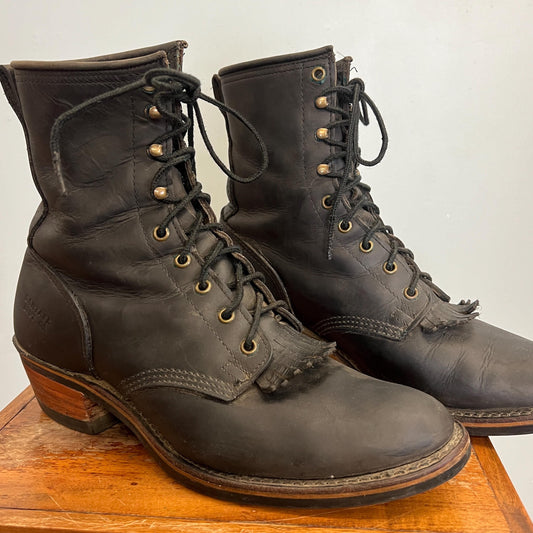 vtg 80s LEATHER FRINGE BOOTS // vintage santa fe lace roper matte black boots wooden heel skinny ankle rounded pointy platform witch style