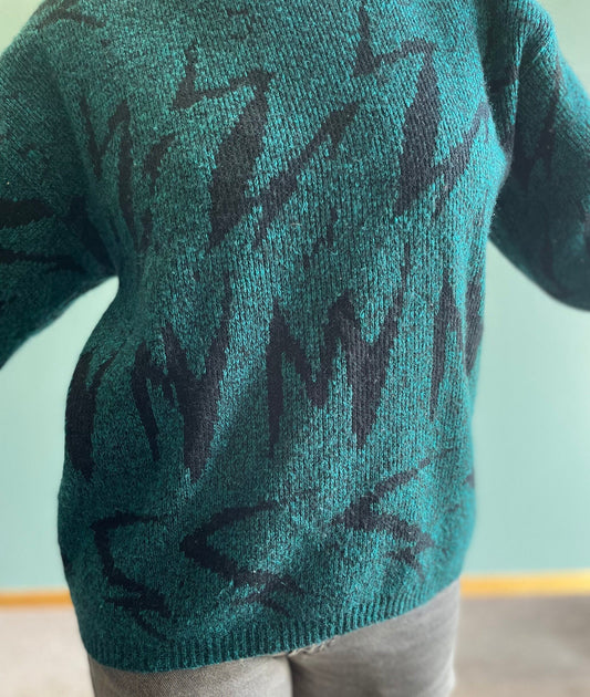 vtg 80s LIGHTNING BOLT SWEATER // vintage squiggle pattern teal abstract print knit silvercord petite large two tone contrast op art casual