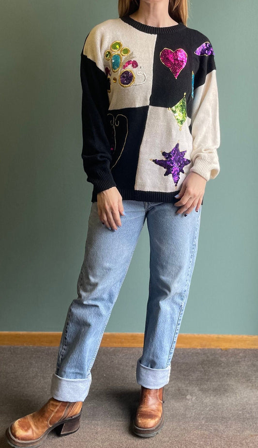 vtg 80s MOD CHECKERED SWEATER // vintage sequin embroidered two tone pop art moschino style fran fine the nanny long retro halloween cozy