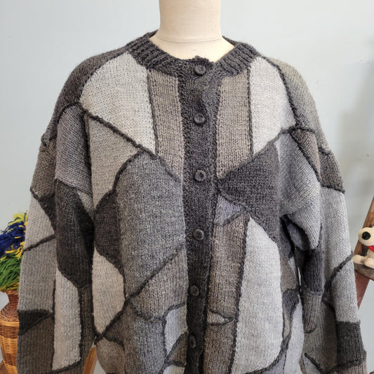 vtg 80s MONOTONE KNIT CARDIGAN // vintage patchwork slouchy sweater geometric stained glass xl oversized abstract 3d knit winter earth tones