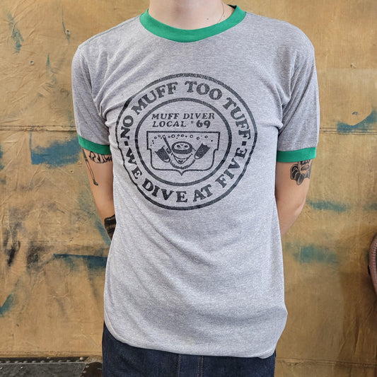 vtg 80s MUFF RINGER TEE // vintage deep sea diving novelty humor lewd crude grey green thin true style wacky ironic heather unisex 69 tee