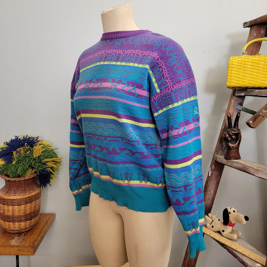 vtg 80s NEON PATTERN SWEATER // milestone New York medium abstract mock neck purple pink black zig zag aztec chunky knit multicolor autumn