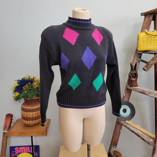 vtg 80s NEON HARLEQUIN SWEATER // vintage funky lizsport size small petite cotton diamond pattern cute cropped mock neck ribbed autumn top