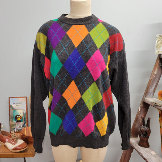 vtg 80s NEON ARGYLE SWEATER // vintage united colors of benetton italy large womens wool harlequin pattern oversized checkered mod retro top