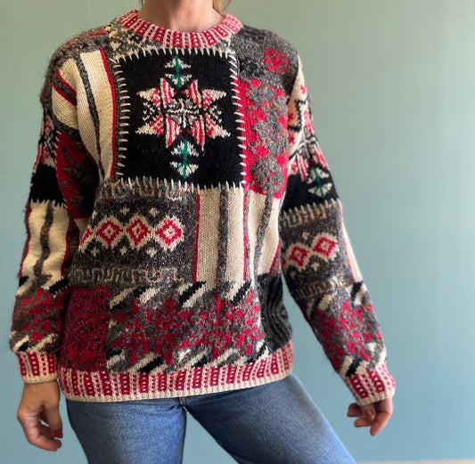 vtg 80s PATCHWORK KNIT SWEATER // vintage abstract pattern hand knit thick wool cozy autumn festive holiday era teacher style casual comfy