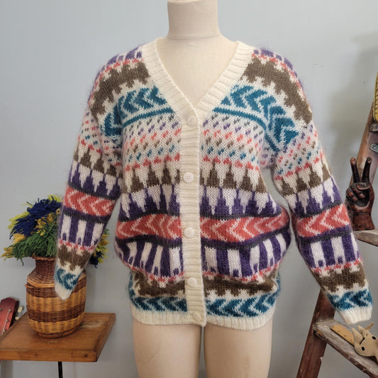 vtg 80s PATTERNED MOHAIR CARDIGAN // vintage knit knit brand small oversized slouchy button up shaggy sweater abstract geometric pattern top