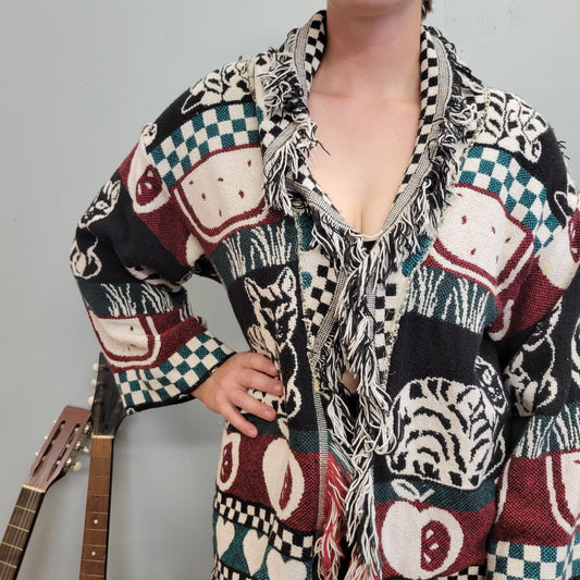 vtg 80s PATTERNED CAT CARDIGAN // cute afghan fringe sweater shaggy oversized teacher core all over print checkered apples warm knit jacket
