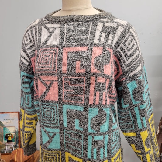 vtg 80s PASTEL GEOMETRIC SWEATER // vintage jolie new york womens large oversized long knit sweater abstract pattern aop cute pastel colors