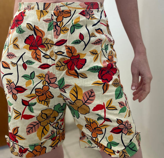 vtg 50s FLORAL LINEN SHORTS // vintage tropical bermuda autumn long shorts small ladies slim form fitting floral pattern flowers side zip