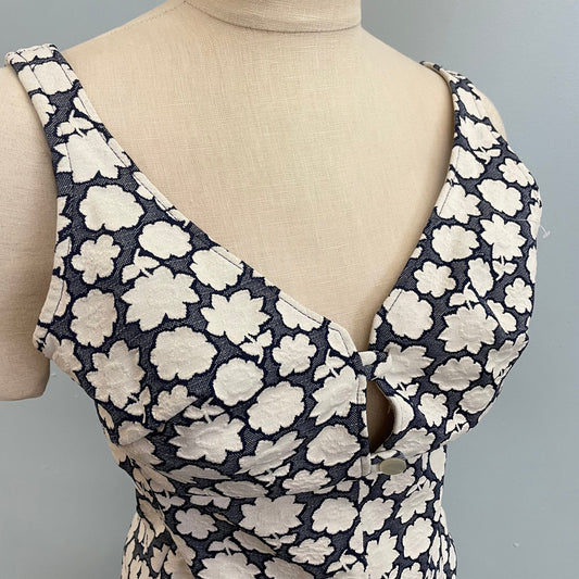 vtg 50s mod floral knit sheath one piece swimsuit blue white flowers pin up style bathing suit mcm retro bullet bra boy shorts playsuit