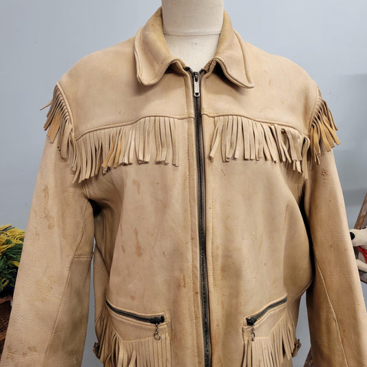 vtg 50s BUCKSKIN FRINGE JACKET / vintage uber owatonna minnesota mens large coat red quilt lining zip up western custom leather biker jacket
