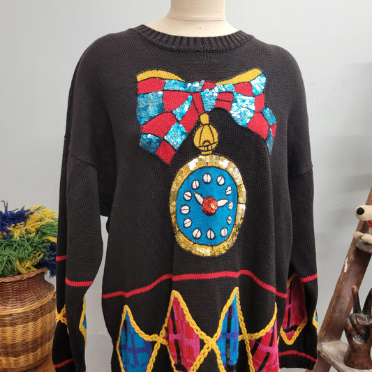 vtg 80s SEQUINED HOLIDAY SWEATER // vintage claus sport womens oversized large christmas new years eve clock wild long sweater dress pop artRegular price $65.00 USDRegular priceUnit price / per-