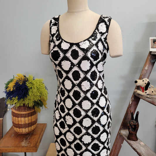 vtg 80s SEQUINED TANK DRESS // vintage tadashi size 8 medium womens holiday new years op art space age black white checkered mod mini dressRegular price $175.00 USDRegular priceUnit price / per-