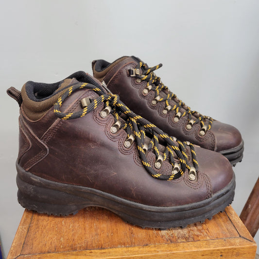 vtg 90s AMERICAN EAGLE BOOTS // 9 size y2k vintage brown leather docs mens contrast yellow shoestrings chunky platform retro hiking style