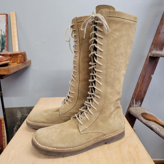 vtg 90s FRYE SUEDE BOOTS// vintage size 10 womens leather uggs style knee high lace up moccasin style hippie autumn winter fashion calf high