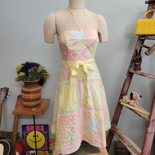 vtg 90s LILLY PULITZER DRESS // vintage pastel patchwork sweetheart halter dress lilly pulitzer size 2 womens usa fit flare belted flirty