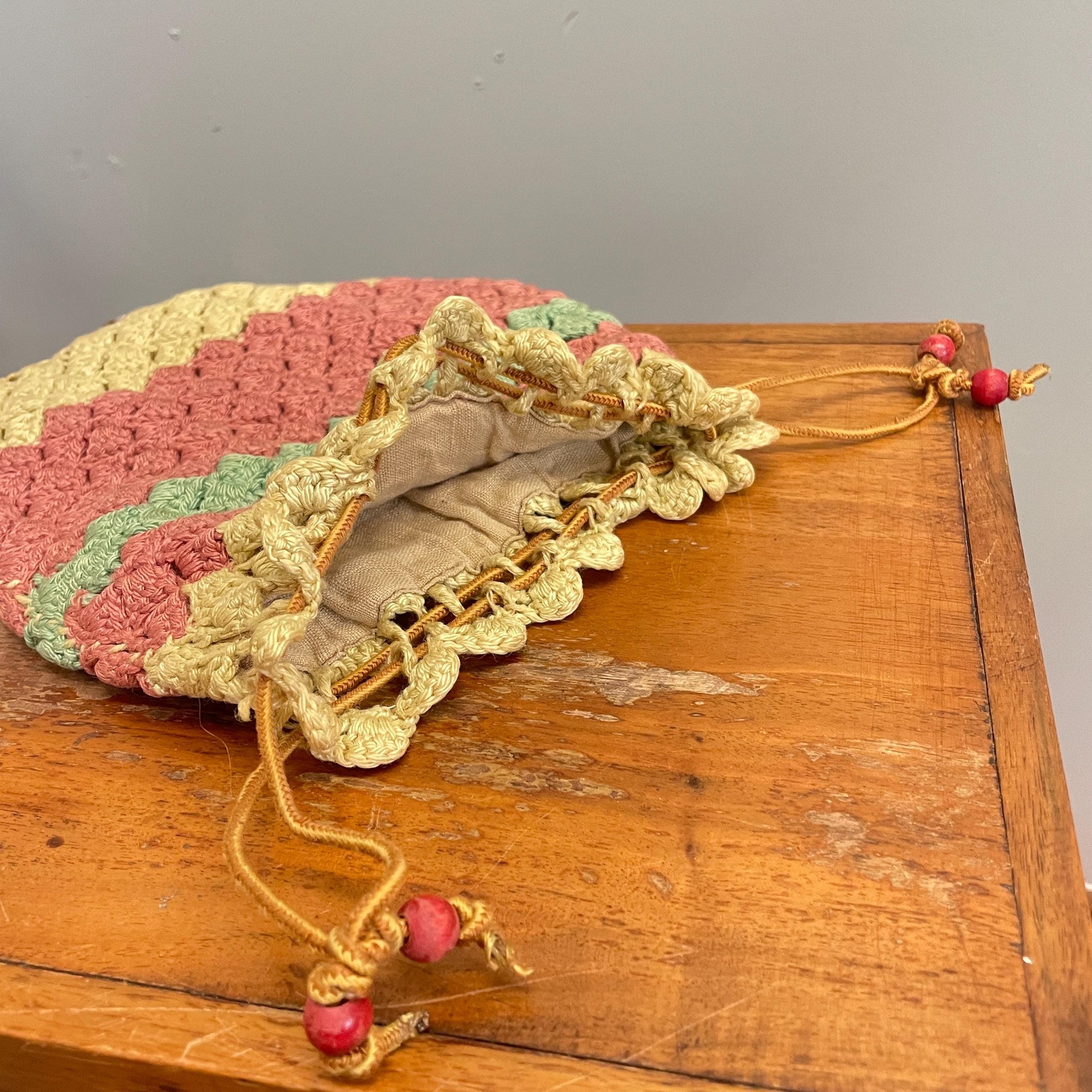 vtg 1940s KNIT POUCH // vintage pastel striped tight thick crochet lined hand bag cute mauve yellow dainty girly cinchy purse 30s accessory