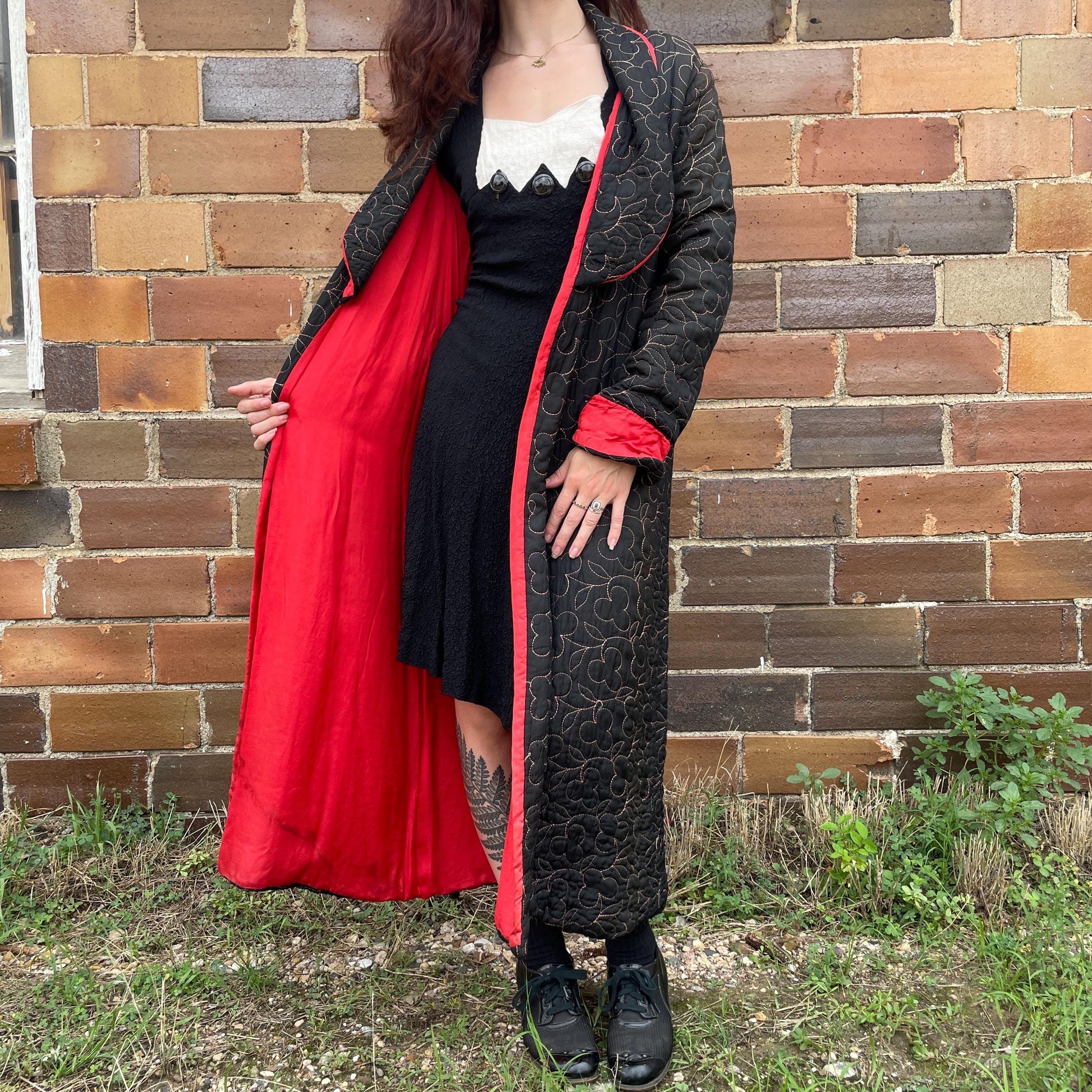 vtg 1940s RED & BLACK ROBE jacket // textured shawl collar red lined gothic house dressing gown embroidered stitched long smoking jacket