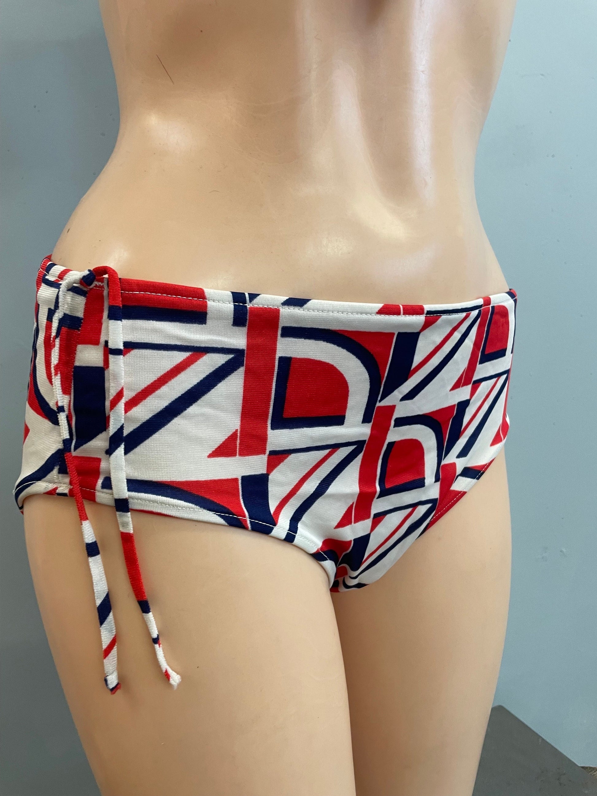 vtg 1960s abstract pop art bikini red white & blue nautical swimsuit hip hugger retro push up mod british classic cut bathing suit skimpy sexy low rise boy short