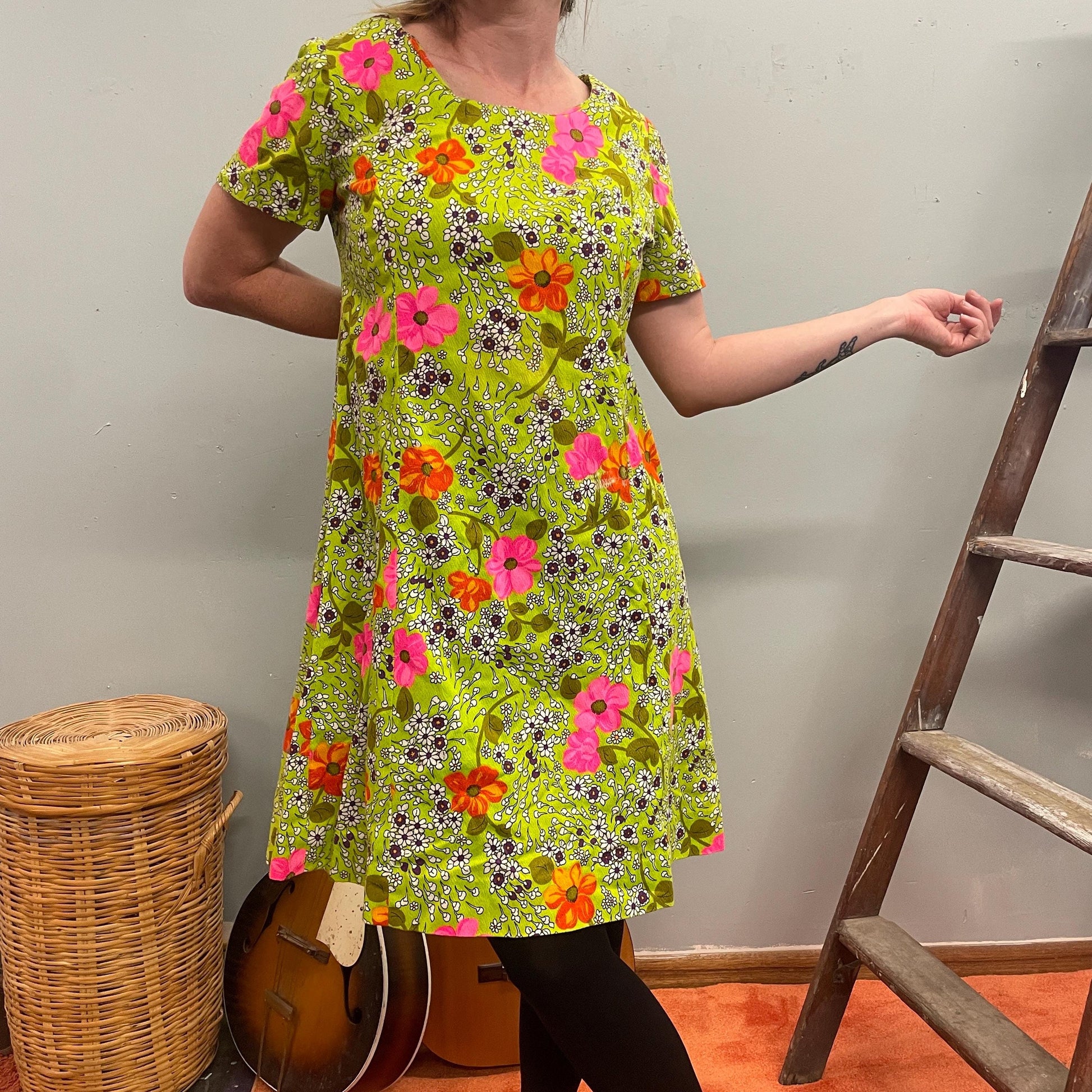 vtg 1960s DAY GLOW FLORAL Dress // vintage neon green & pink hawaiian tent style mini dress bright funky flower power mod retro kitshy twee
