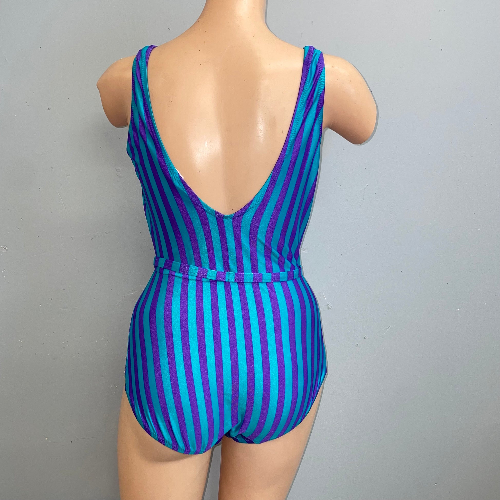 vtg 1970s 80s shiny striped deep v swimsuit low cut blue & purple belted tank bathing suit leotard unitard bodysuit playsuit retro glam