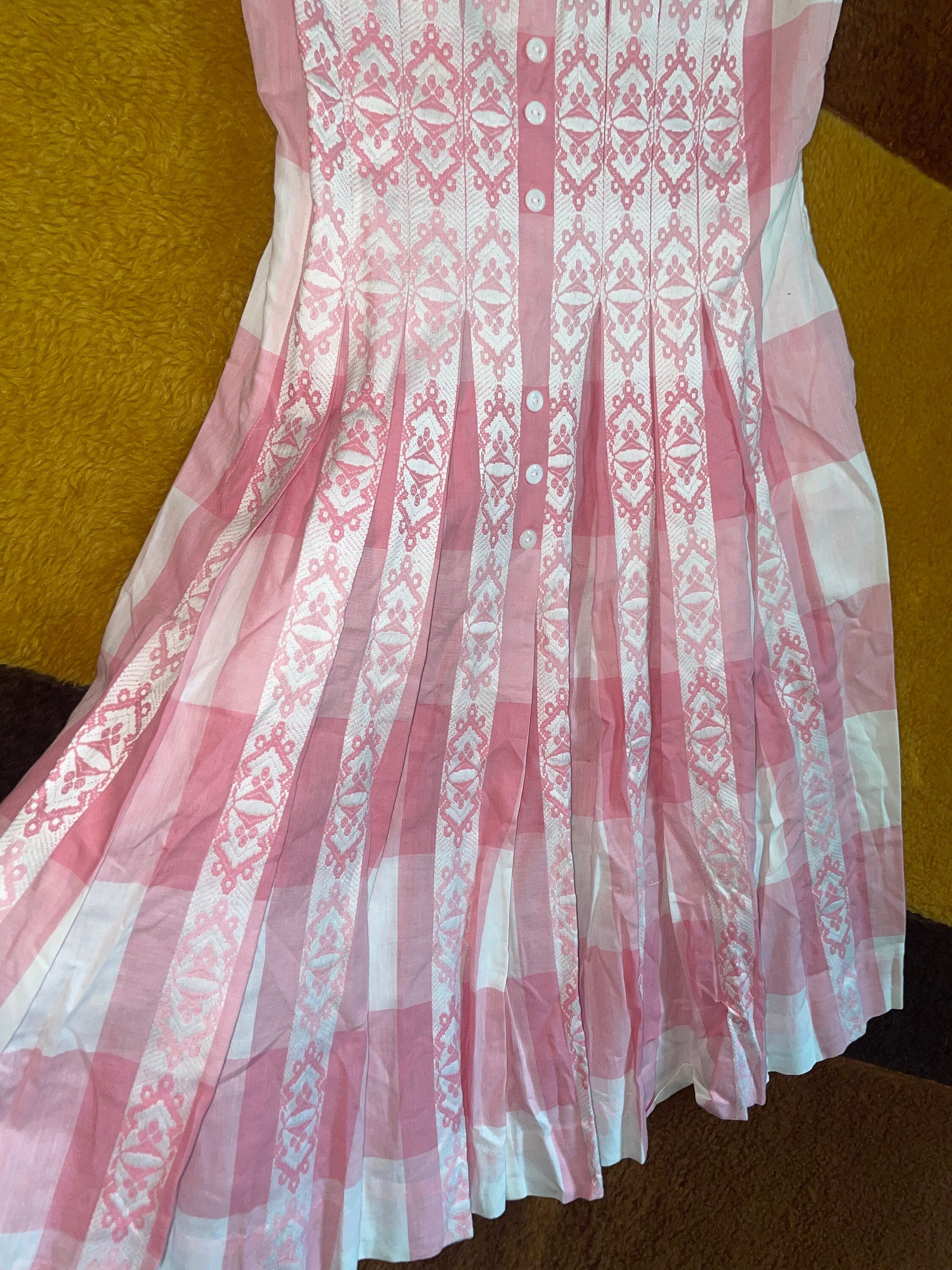 vtg 40s pocket dress pink & white cotton plaid boat neck fit n flare day dress embroidered abstract print pastel preppy side zip spring summer cute sweet