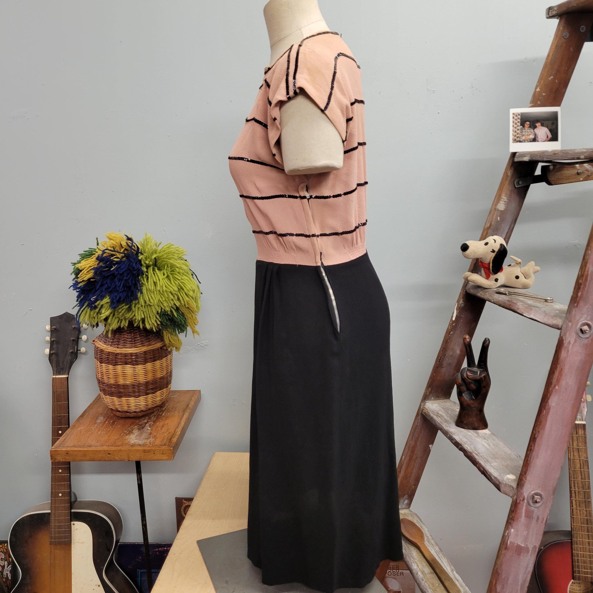 vtg 40s RAYON SEQUIN DRESS // fixer upper as is crepe beaded pastel 1930s art deco fancy evening cocktail dress peach & black two tone gown