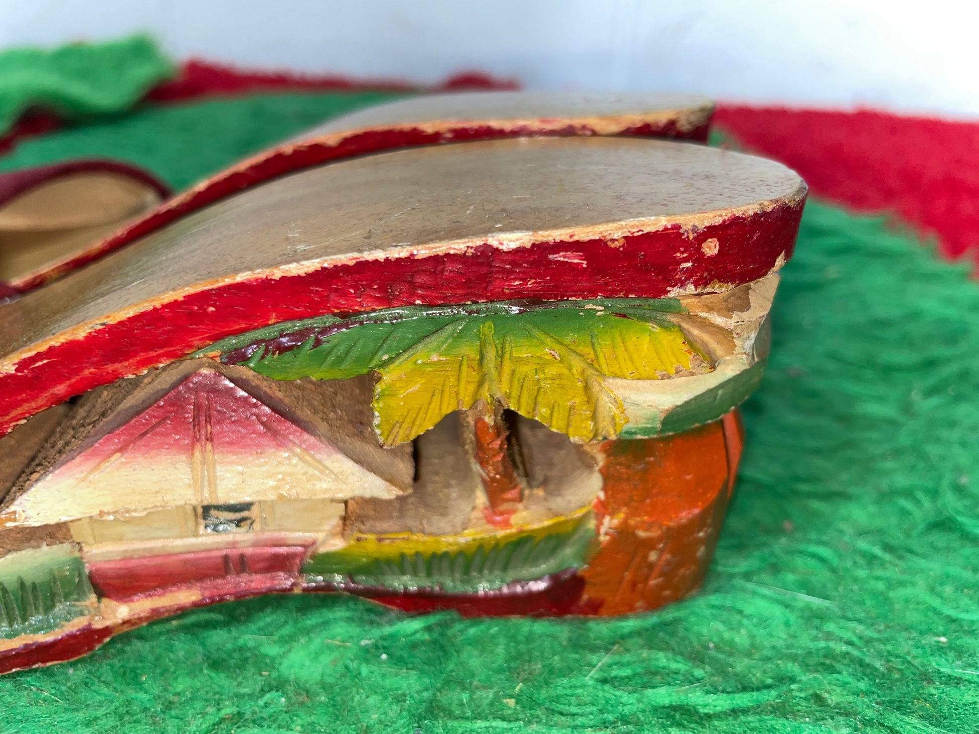 vtg 40s WW2 Era WOODEN HEELS // vintage Red Carved Wooden Platforms / 40s Velvet Shoes / Souvenir Wedge Sandals