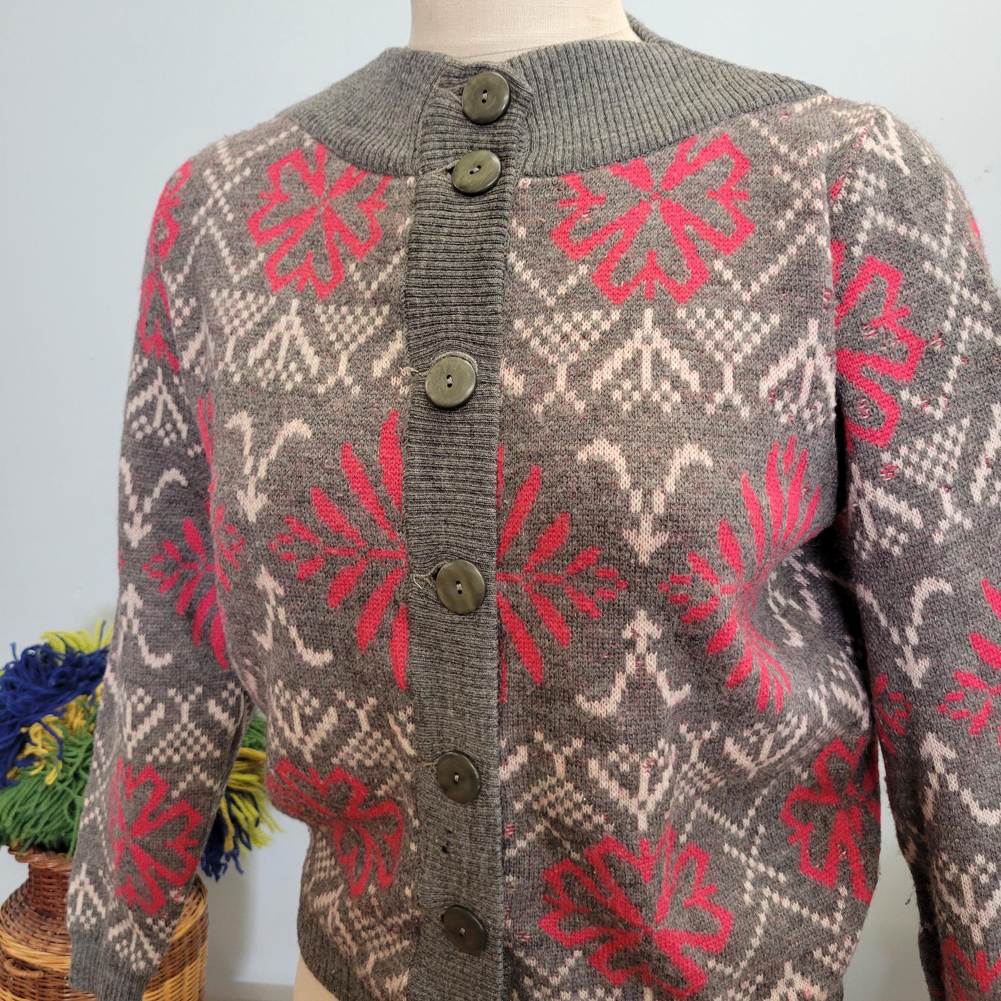 vtg 50s 4 LEAF CLOVER Cardigan // vintage catalina abstract sweater size 40 gray red & white button up cropped rockabilly preppy aop knit