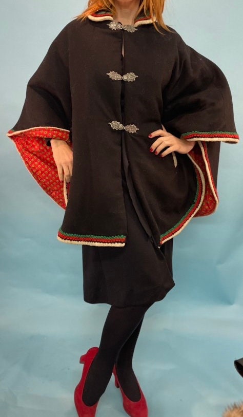 vtg 50s BLACK WOOL CAPE // Scandinavian Style Festive Winter Coat // Oktoberfest femme dracula costume red riding hood swedish german norsk