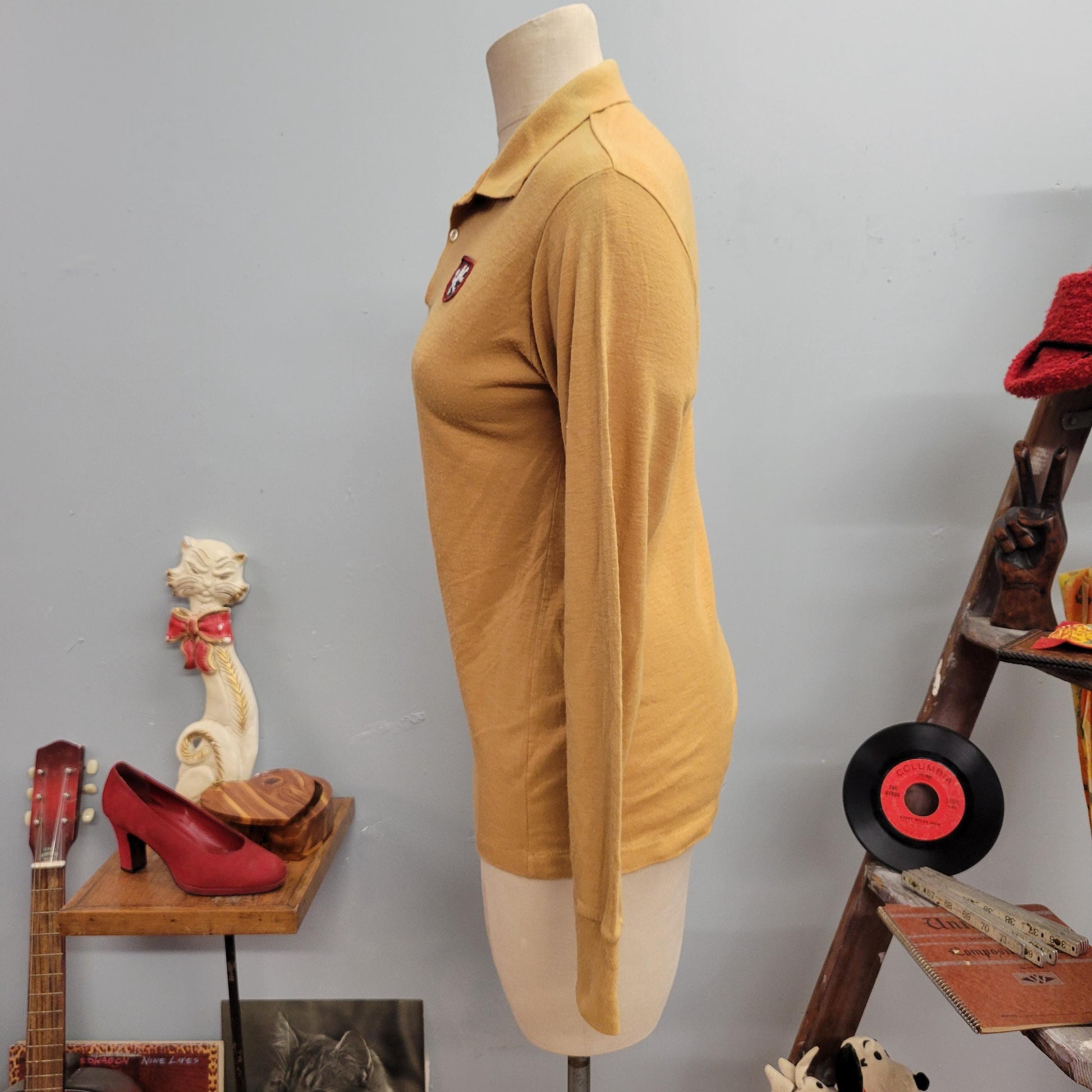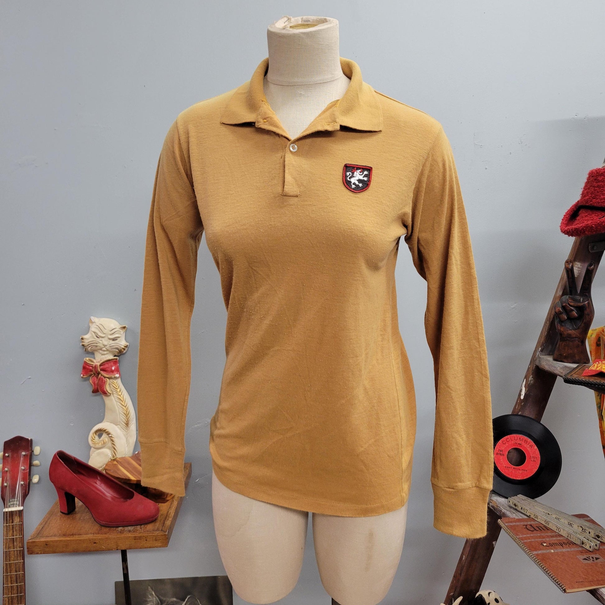 vtg 50s COLLARED EMBROIDERED SHIRT // vintage munsingwear griffin crest emblem patch faded collared pastel mustard retro 60s workwear blouse