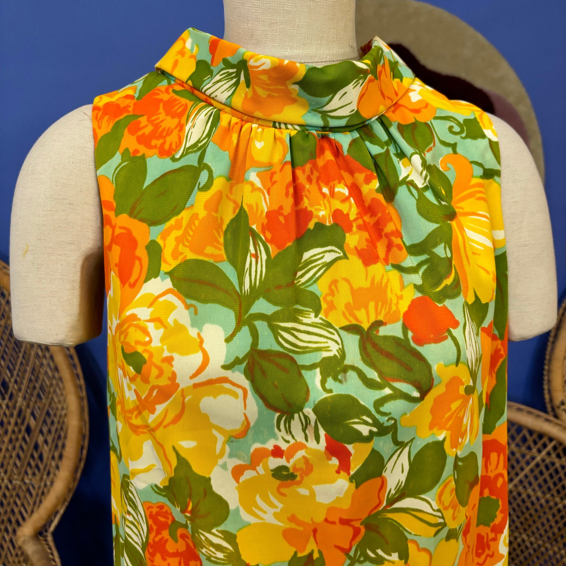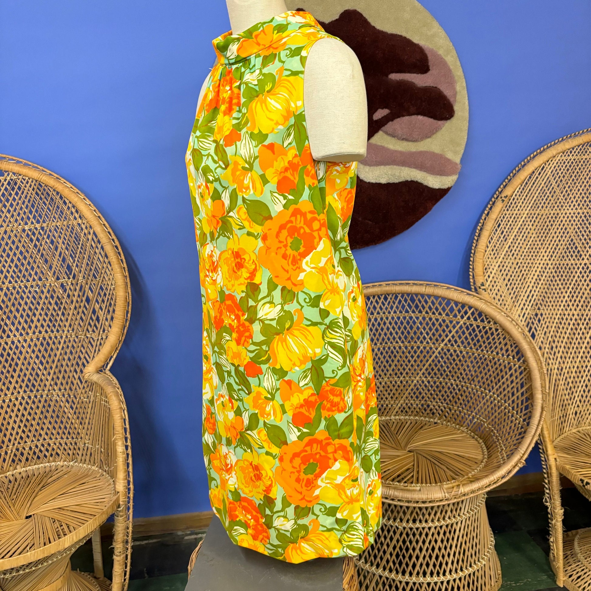 vtg 50s FLORAL DRESS // vintage marigold flower power psychedelic mod slinky jersey mini shift dress sleeveless bright autumn party hostess