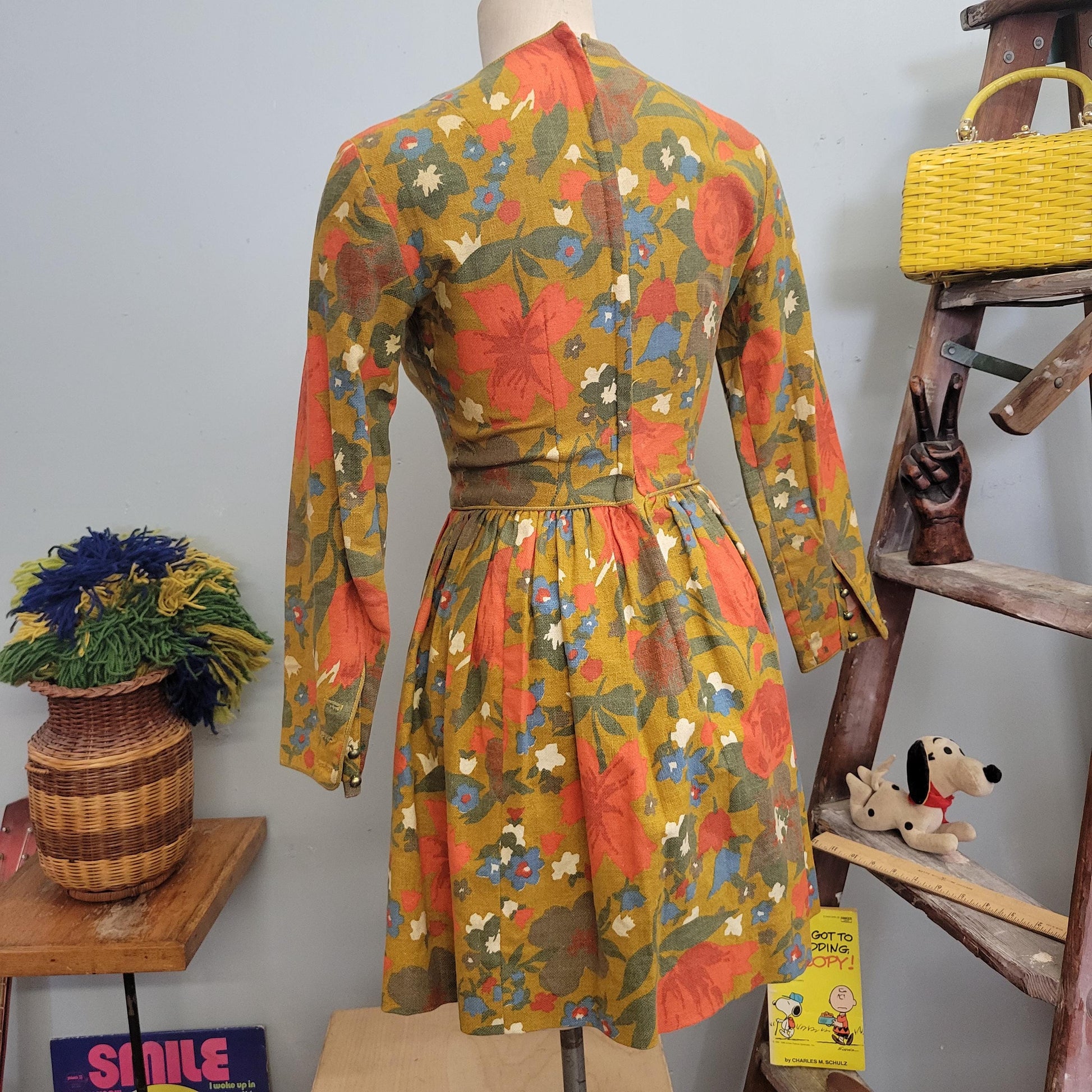 vtg 50s LINEN ROSE DRESS // vintage womens small fall floral pumpkin tones long sleeve fall fit n flare mini floral sweater dress garden day