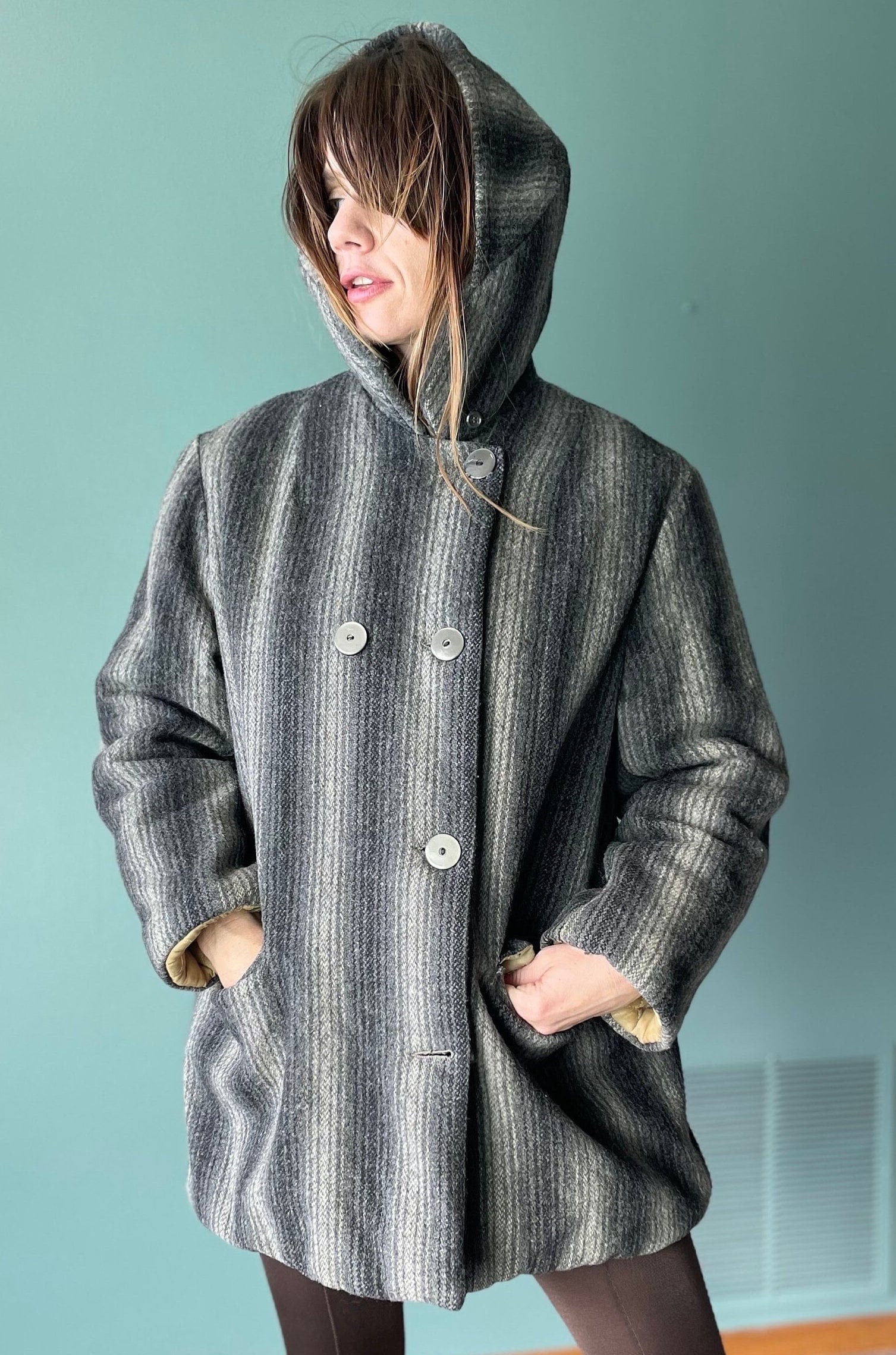 vtg 50s SHADOW STRIPED HOODED Coat // vintage quilted gray stripes wool autumn stylish winter jacket 60s warm parka overcoat stroller style