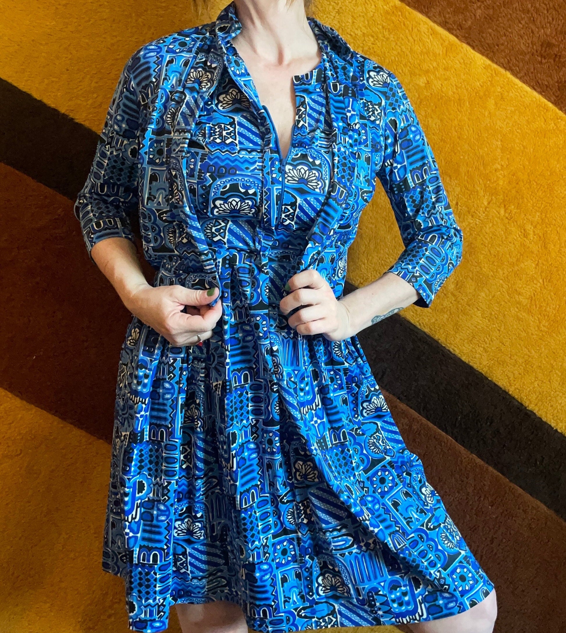 vtg 60s 2 PIECE JERSEY DRESS // abstract pattern set with pockets school outfit bright blue tiki party mod retro autumn layers teacher style