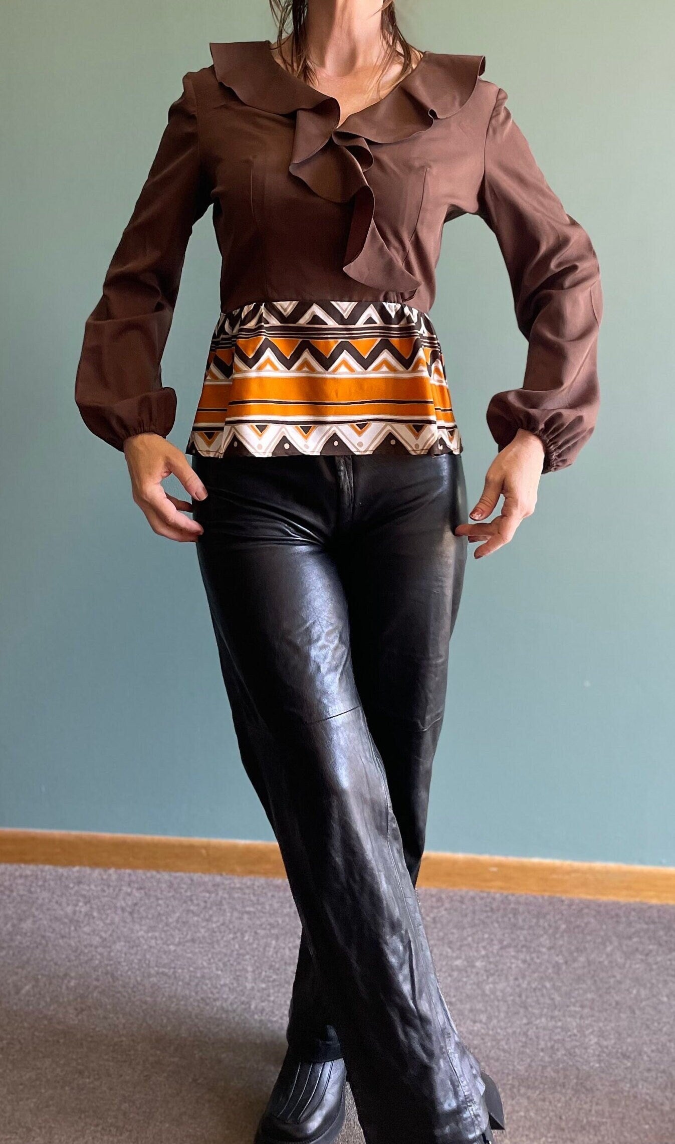 Vintage 60s Chocolate Brown & Orange Abstract Print Ruffle Collar Blouse / Halloween Vibes / Balloon Sleeve Blouse Mod Hippie Top