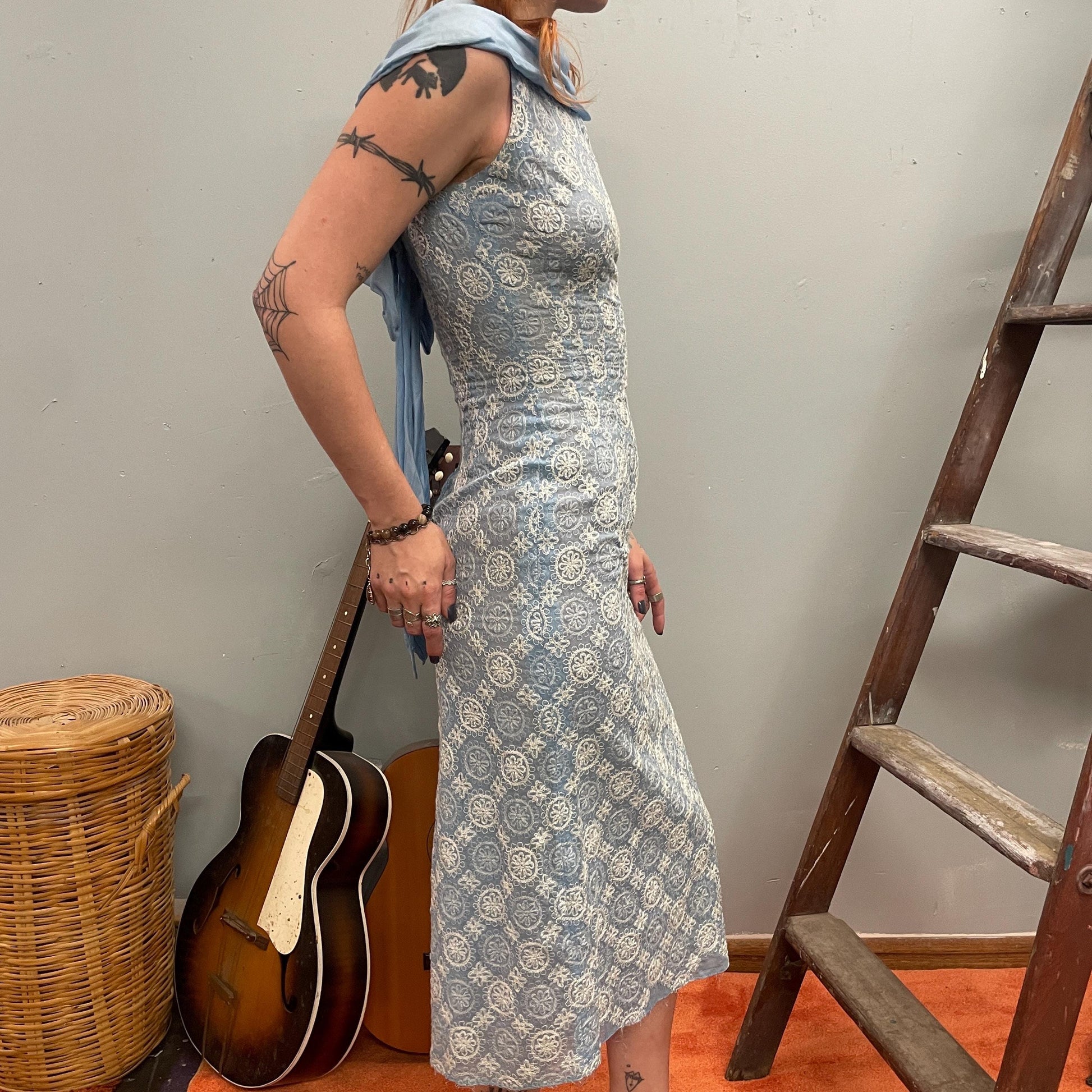 vtg 60s BOW TIE SHAWL // vintage chiffon bow net lace embroidered full length fancy evening gown floral ethereal blue flowy photo shoot gown