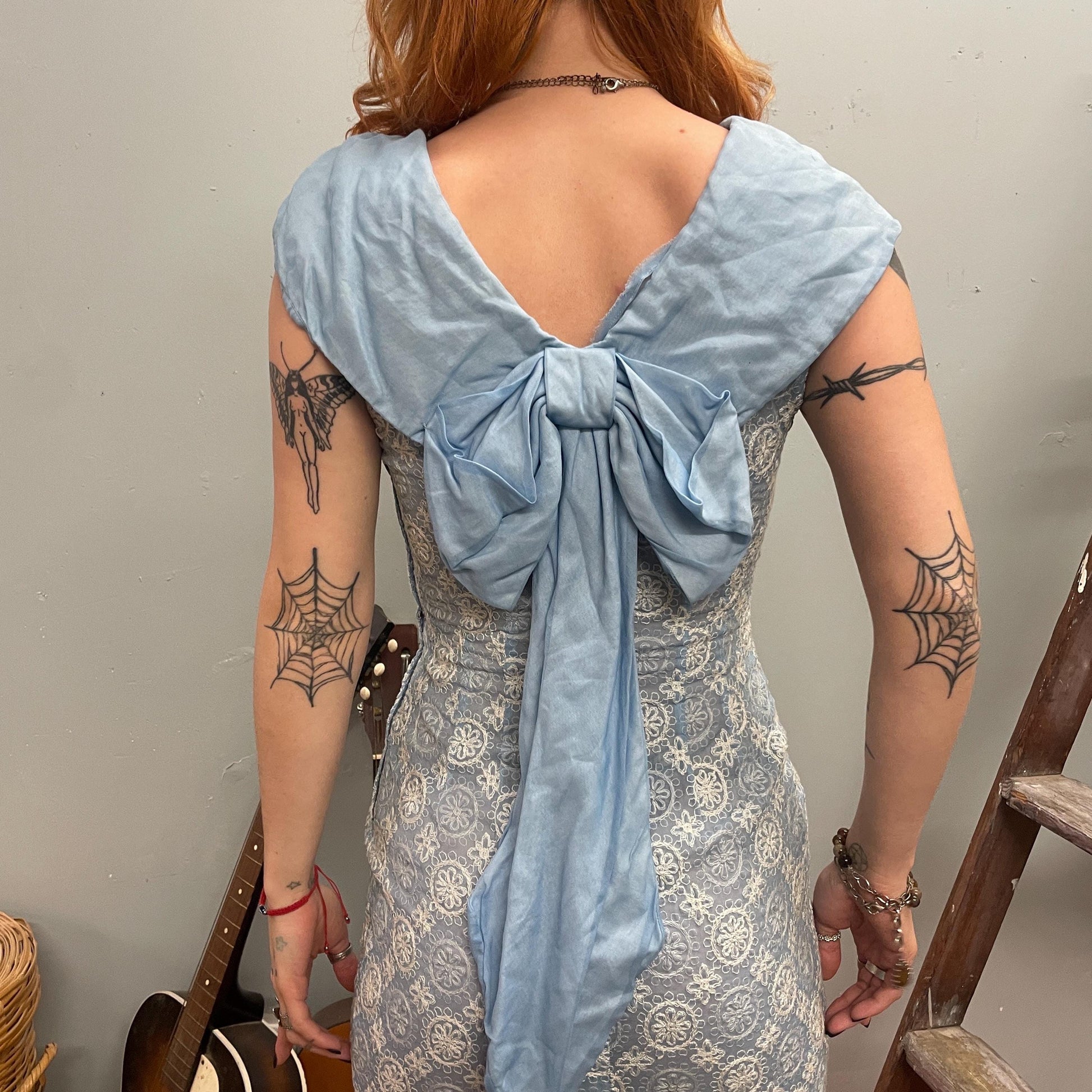 beautiful ice blue 1940s 50s net iverlay long chiffon bow shawl collar hostess party dress