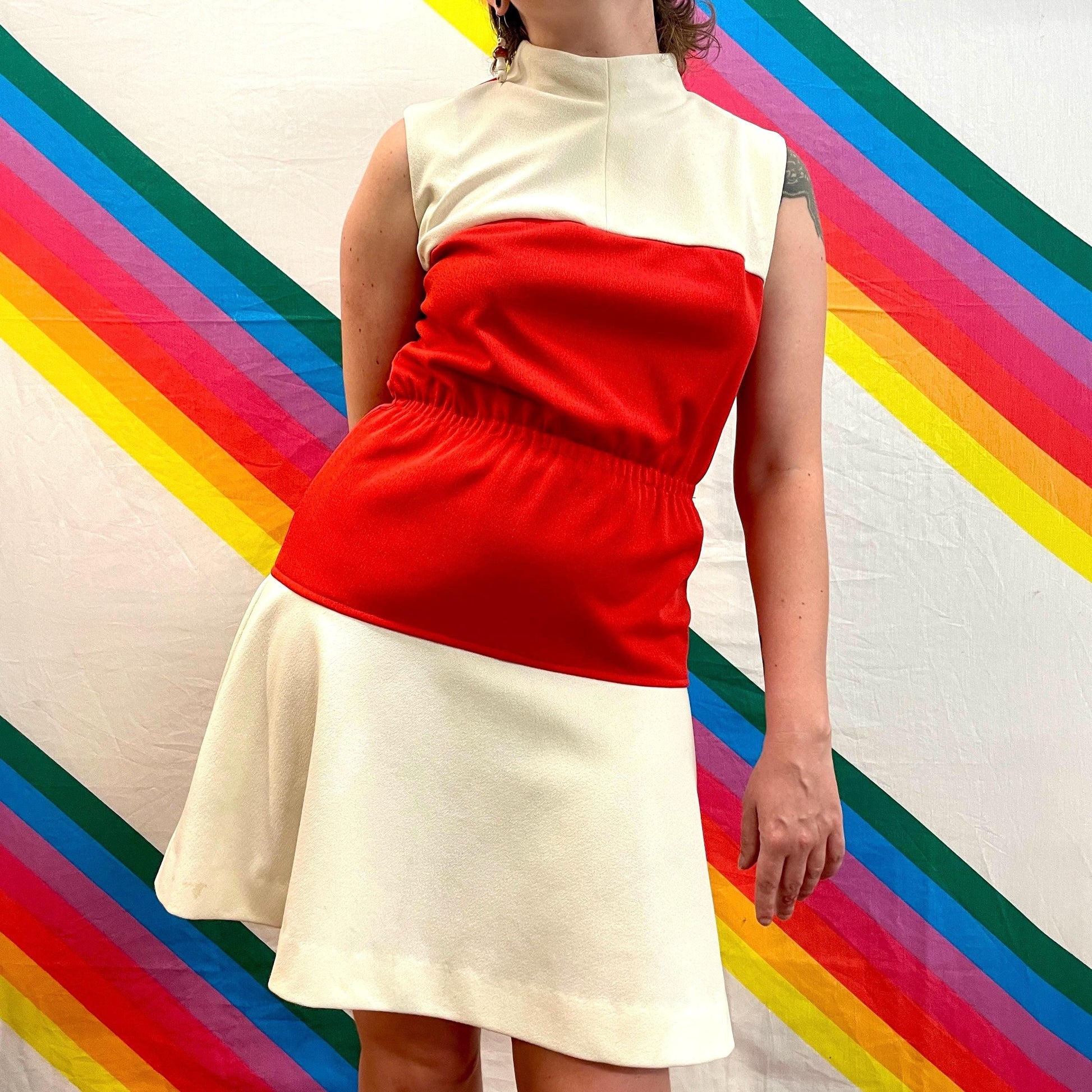 vtg 60s COLORBLOCK MOD DRESS // two tone red & white fit n flare mini scooter dress retro colorway twiggy space age sleeveless autumn fall