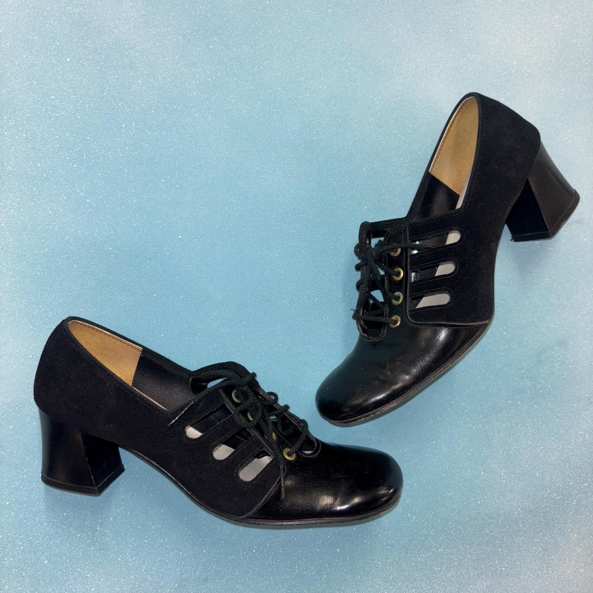 vtg 60s CUT OUT PUMPS // vintage mod black leather & suede chunky platform heels lace up retro stacked loafers soft goth wednesday addams